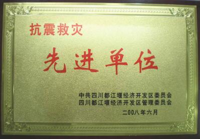 “5.12”汶川地震發生后,四川中金醫藥包裝有限公司全體員工一方面立即組織生產自救,另一方面組織人員于第一時間趕赴災區,積極投入到抗震救災工作當中。日前,公司被中共四川都江堰經濟開發區委員會和四川都江堰經濟開發區管理委員會授予“抗震救災先進單位”稱號。