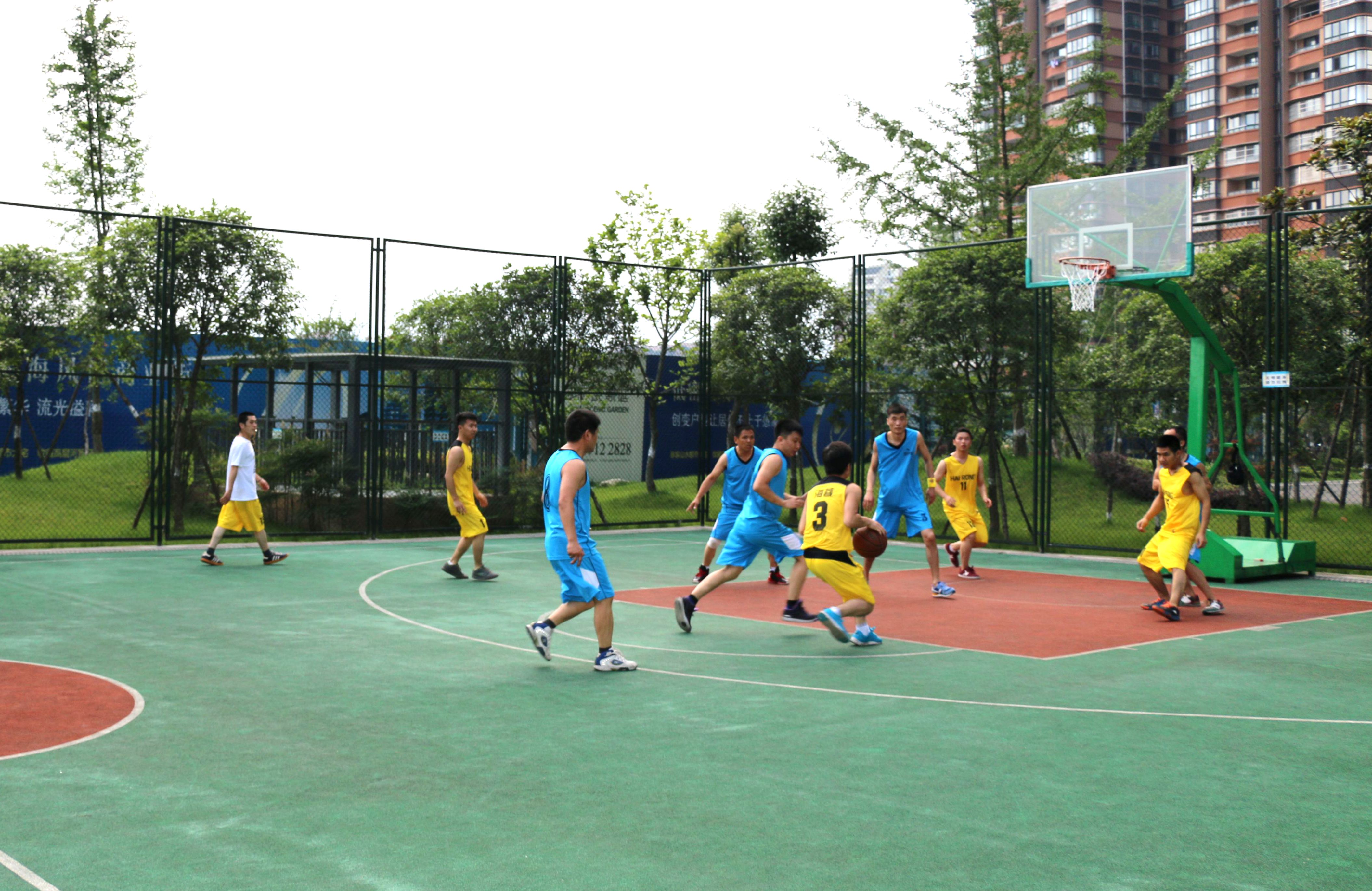 中金公司隊員著藍色球服出場,揚子江海蓉藥業隊員著紅色球服出場,一場紅藍之爭即將開始。隨著裁判的一聲哨響,把球高高拋起,雙方爭球的隊員縱身一躍,激烈的籃球爭奪賽就此開始了。隊員們你不讓我,我不讓你,各自為了進球竭盡所能。為了使每個球員都能充分發揮各自的作用,雙方球隊的隊長緊鑼密鼓地排兵布陣。紅藍雙方隊員都緊盯著球,積極地進行運球、傳球、投籃,看誰先投進對方籃筐一球。開場幾分鐘,雙方對未能如愿,各自都在對方籃筐處投球而沒有一個進球,可能確實和平時練習的高度不一致有關系。幸好大家都及時進行了力度和投球角度的調整,各隊隊員都迅速進入狀態,你爭我搶,你攻我守,每分必爭,兩隊比分交替領先,實力不分伯仲,雙方都打出了自己水平,賽出了各自的風采。