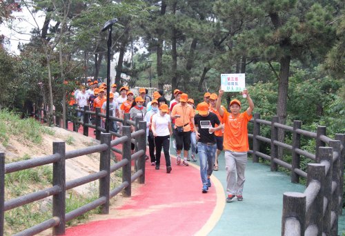北固山風景秀麗、山色蔥郁,集林海、山石風光為一體,沿著5公里的仿木護欄一路前行,好似行走在詩情畫意中,伴隨著一路的草木清香和清涼涼的海風,讓人身心俱醉,回歸自然。5公里的路程走起來也需要很大的體力、耐力和毅力,終點清晰可見,而跨越終點才是勝利,領先的隊伍絲毫不敢放松,后面的隊伍隨時都會趕超上來,沖刺的決心使大家的腳步沒有絲毫懈怠。肆意揮灑的汗水,盡情釋放的能量,讓人盡享健康運動帶來的無比快樂。