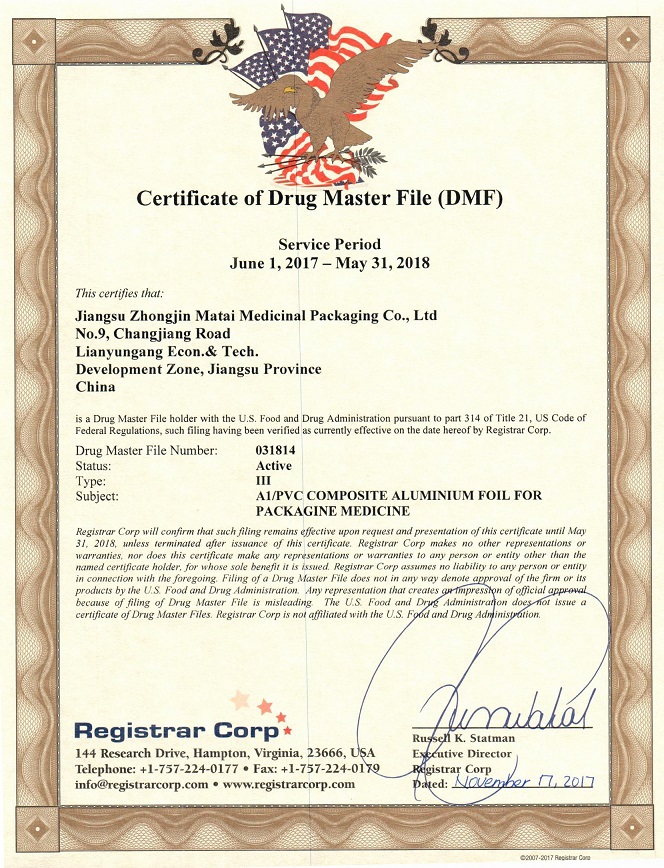早在2006年開始,中金瑪泰就已著手研發具有兒童保護功能的藥品包裝材料,十多年來,經過公司技術研發人員的不懈努力,對產品原理、原料、工藝、安全性、保護性、功能性、相容性等進行了深入的研究,推出多種結構的產品,并取得專利一項。今年,其中一款結構為AL/PVC藥用復合鋁箔獲得客戶青睞,接到歐盟產品訂單,并由研發人員自行編制技術資料,申報美國DMF備案,2017年11月17日通過審核,獲得美國FDA頒發的DMF備案號031814。