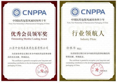 為了表彰為行業(yè)發(fā)展和協(xié)會成長做出突出貢獻的會員企業(yè)與個人,本次大會還進行了中國醫(yī)藥包裝風雨同舟四十周年表彰頒獎活動。江蘇中金瑪泰醫(yī)藥包裝有限公司榮獲協(xié)會頒發(fā)的企業(yè)最高獎項“優(yōu)秀會員領(lǐng)軍獎”,徐根華總經(jīng)理榮獲個人獎最高殊榮“行業(yè)領(lǐng)航人”,何建忠副總經(jīng)理榮獲“突出成就獎”。