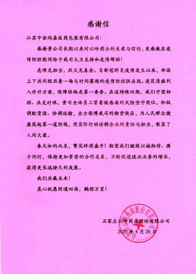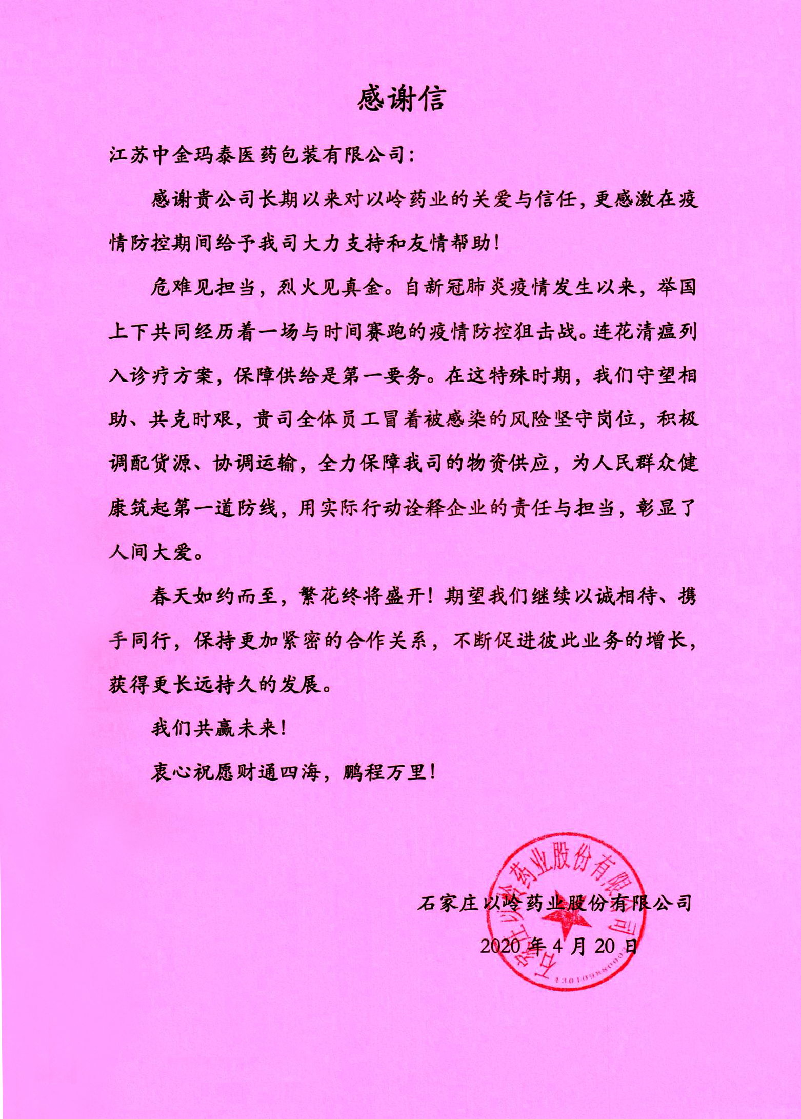 4月20日,中金瑪泰收到一封來自石家莊以嶺藥業的感謝信,感謝中金瑪泰在疫情防控期間給予以嶺藥業的大力支持和幫助。信中提到 “在抗擊疫情的關鍵時期,我們守望相助、共克時艱,中金瑪泰全體員工冒著被感染的風險堅守崗位,積極調配貨源、協調運輸,全力保障以嶺藥業的物資供應,為人民群眾健康筑起第一道防線,用實際行動詮釋企業的責任與擔當,彰顯了人間大愛。”