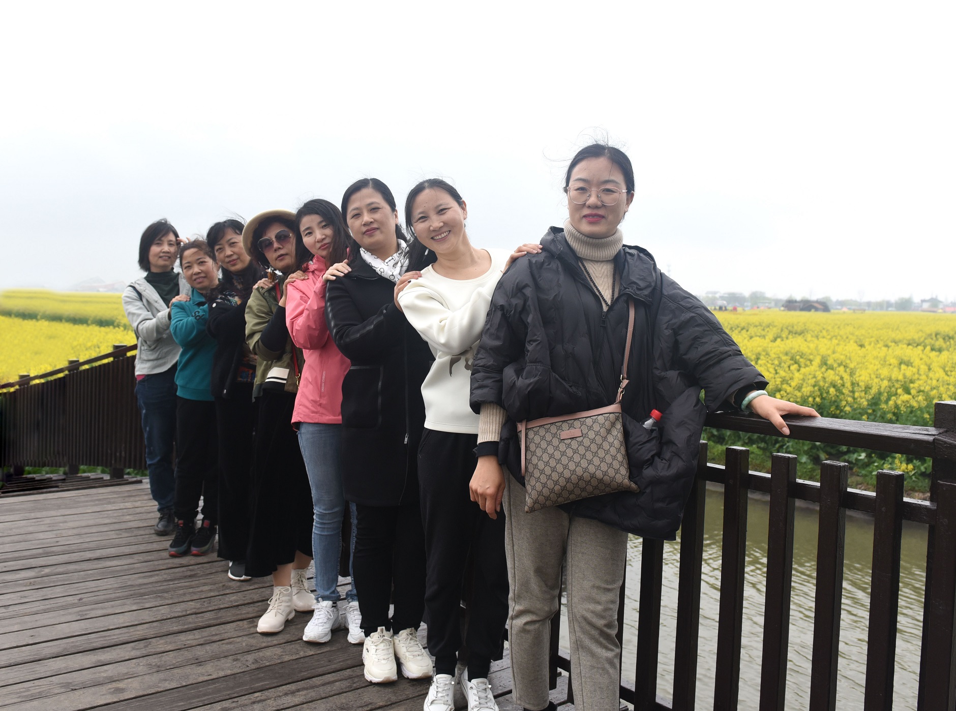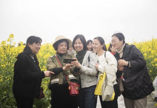 雖然天公有些不作美,出發(fā)時(shí)小雨淅瀝,但這依然阻擋不了大家親近自然的熱情與腳步,迎著春雨過(guò)后的暖風(fēng),我們來(lái)到了此行的第一站,被譽(yù)為全球“四大花海”之一的江蘇興化千垛景區(qū)。景區(qū)內(nèi)河港縱橫,一片片金黃的油菜花綻放于垛田之上,與藍(lán)天碧水交相輝映,織就了一幅“河有萬(wàn)灣多碧水,田無(wú)一垛不黃花”的綺麗畫(huà)卷。在導(dǎo)游的帶領(lǐng)下,大家登上游船,盡情領(lǐng)略“船在水中行,人在花中游”的美麗景觀。行至岸上,金黃的菜花在風(fēng)中搖曳,清風(fēng)襲來(lái),花香四溢,沁人心脾。大家三五成群,漫步于田間花海之中,邊走邊聊,邊走邊拍,歡聲笑語(yǔ)中,盡享這花香滿(mǎn)徑,春色怡人的爛漫時(shí)光。